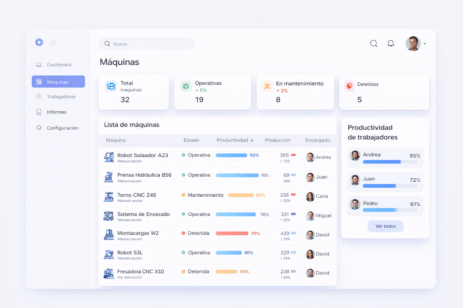 Indicadores y paneles para ver qué pasa en planta o en oficina y priorizar las mejoras con mayor impacto en el negocio.